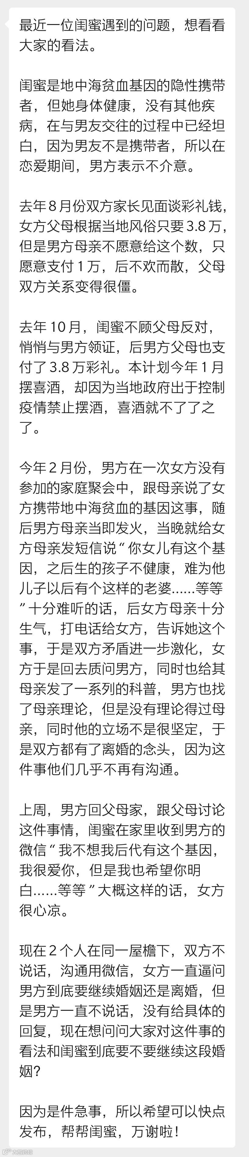 一位女生帮闺蜜投稿说,她闺蜜是地中海贫血基因的隐性携带者,但身体健康,没有其它疾病,与男友交往过程中坦白过,男友非携带者,表示不介意,也没有和自己父母说。