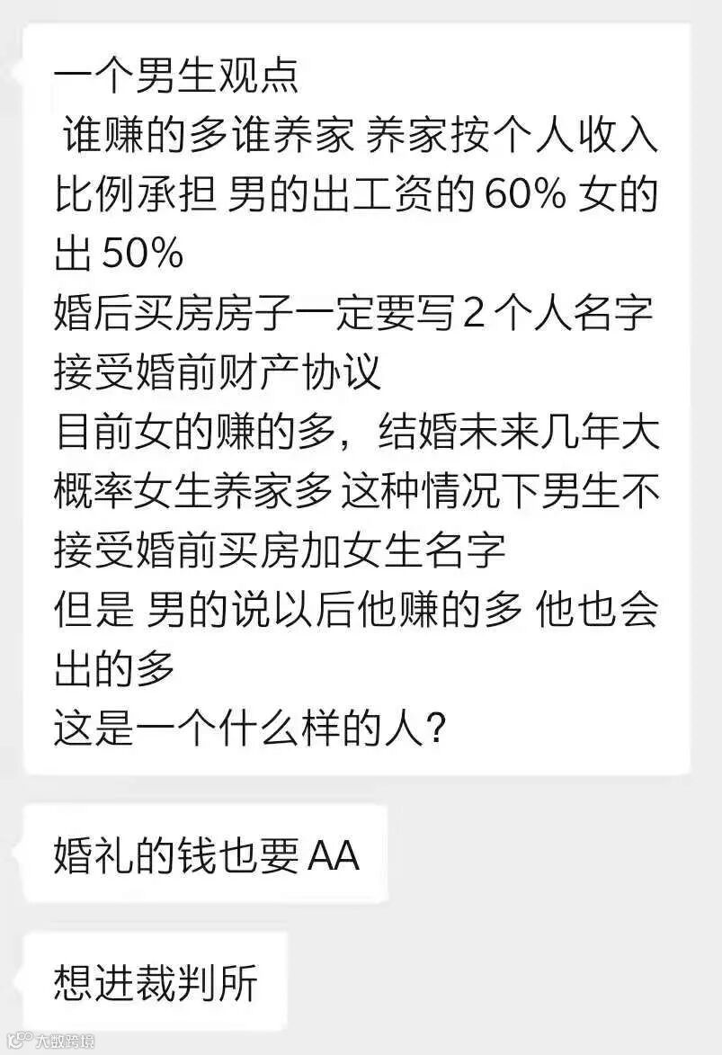 一位男生提出,他接受签婚前财产协议,婚后夫妻双方按收入比例养家,男方出工资得60%,女方出50%。