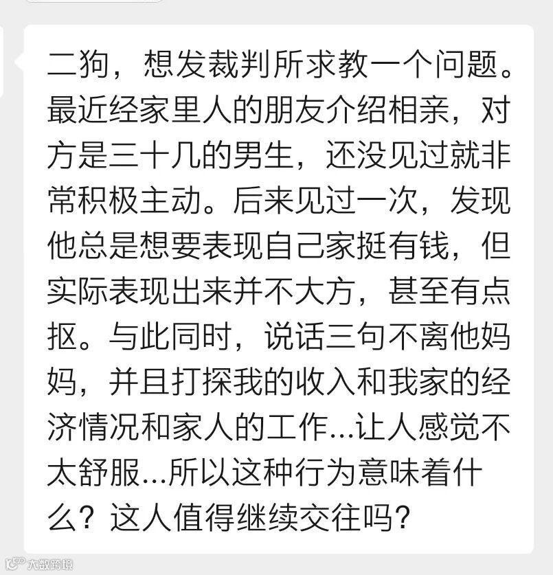 今天投稿的是一位女生,她经家人朋友介绍,认识了一位三十几岁的男生。对方非常积极主动,见过一次面,令女生感觉不太舒服的是,男生话里话外都在暗示他家里有钱,但实际表现并不大方,甚至有点抠门。而且三句不离他妈妈,并打探女生的收入和家庭经济情况。