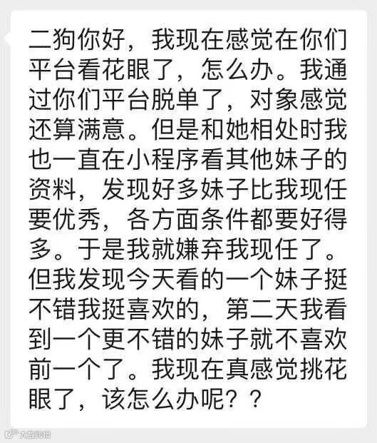 一位男生投稿说,他通过平台脱单了,对女朋友还算满意,但他忍不住继续在平台看其他女生的资料,发现好多女生各方面条件都比自己女朋友要好,于是就有点嫌弃现任了。