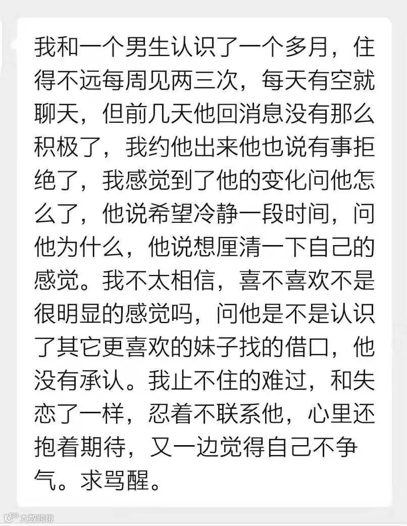 一位女生投稿说,她和一位男生认识一个多月,每天一有空就聊天,住得不远每周见两三次。正当她觉得情渐浓时,男生突然提出想要冷静一段时间,厘清自己的感觉。女生表示不信,问他是不是遇到了其它妹子找的借口,男生没有承认。