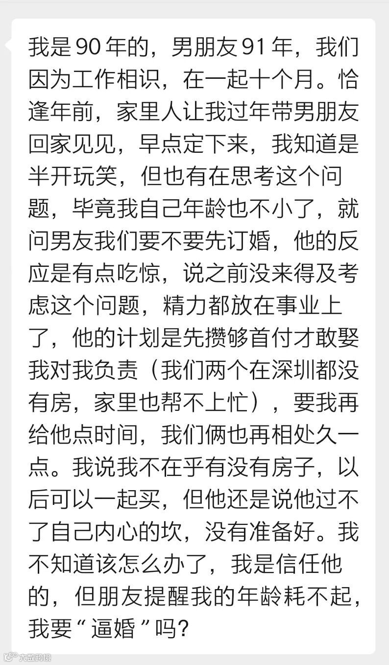 今天投稿的是一位90年的女生,她的男友91年,两人因为工作相识,在一起十个月。恰逢年前,她家人提起让她和男友早点定下来,带回家看看。女生觉得自己年龄也不小了,于是问男友要不要先订婚。男友的反应是有点吃惊,然后解释说之前没来得及考虑这个问题,精力都放在事业上了,他计划先攒够