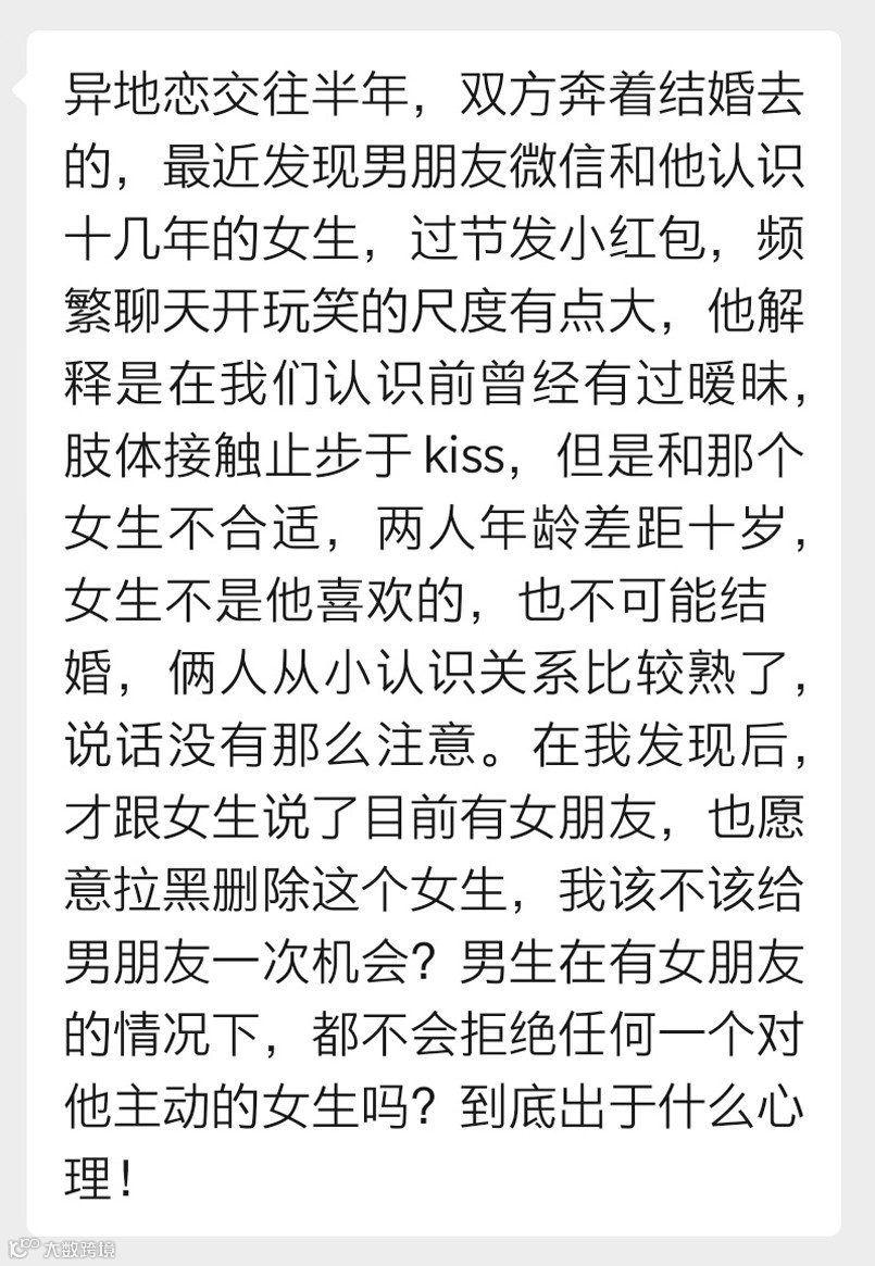 今天投稿的是一位女生,她和男友异地交往半年,最近发现男友在微信上和认识十几年的女生频繁聊天,开大尺度玩笑、过节发小红包。