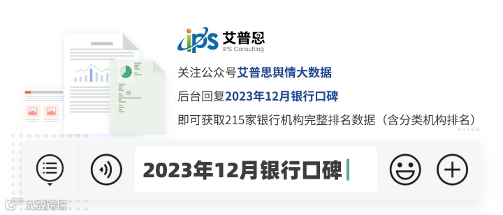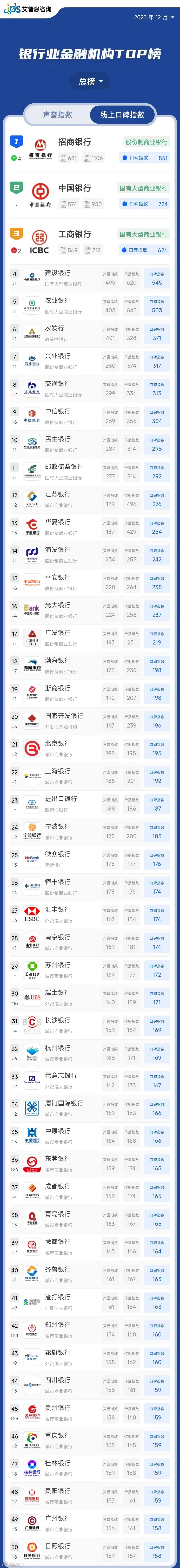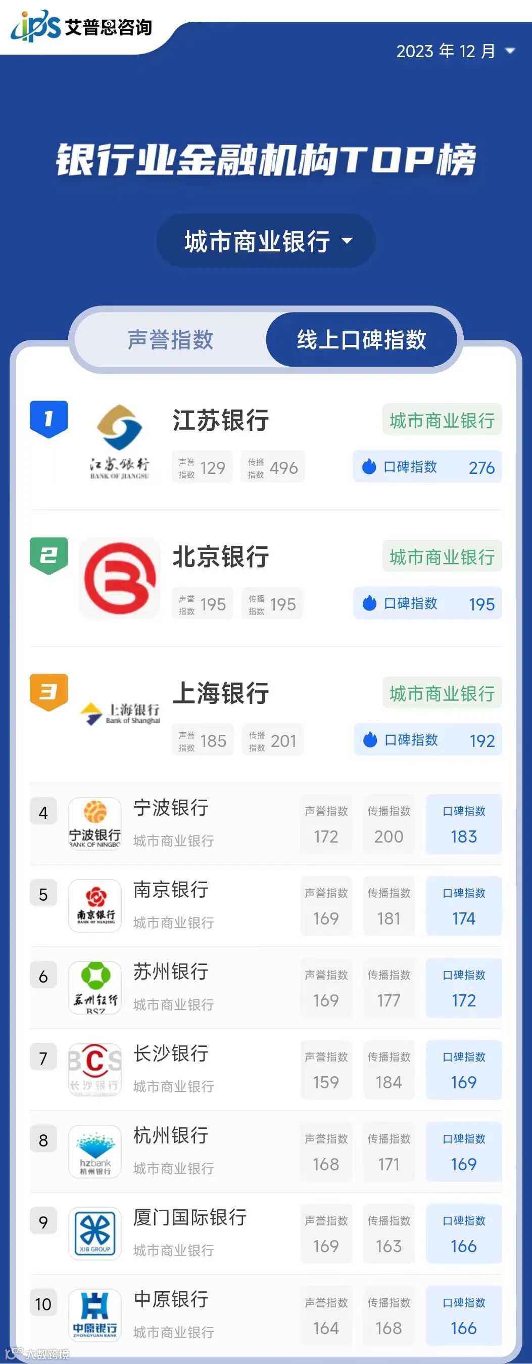 2023年12月线上口碑指数排名前三的银行业金融机构为:招商银行(股份制商业银行,口碑指数851,排名较上月上升4位)、中国银行(国有大型商业银行,口碑指数724,排名与上月持平)、工商银行(国有大型商业银行,口碑指数626,排名较上月下降2位)。