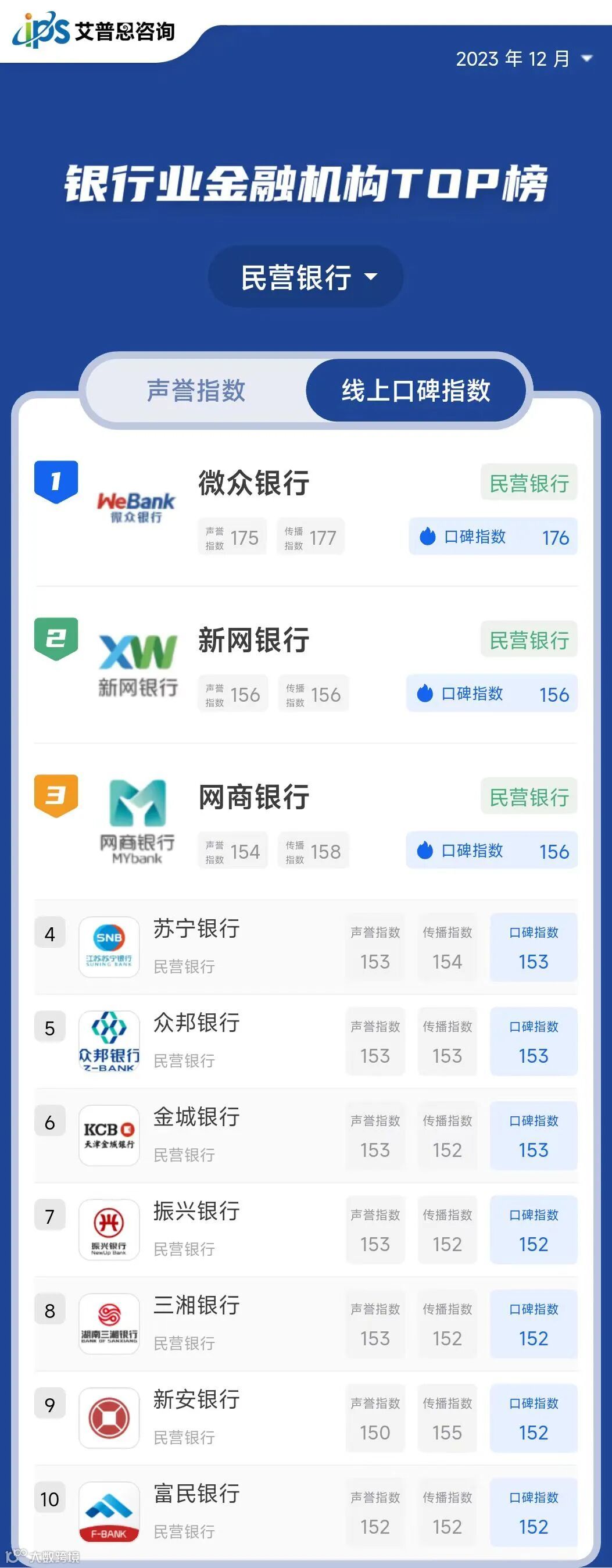 线上口碑指数排名前三的国有大型商业银行为:中国银行、工商银行、建设银行;线上口碑指数排名前三的股份制商业银行为:招商银行、兴业银行、中信银行*;线上口碑指数排名前三的城市商业银行为:江苏银行、北京银行、上海银行*;线上口碑指数排名前三的民营银行为:微众银行、新网银行、网商银行;线上口碑指数排名前三的外资法人银行为:汇丰银行、瑞士银行*、德意志银行。