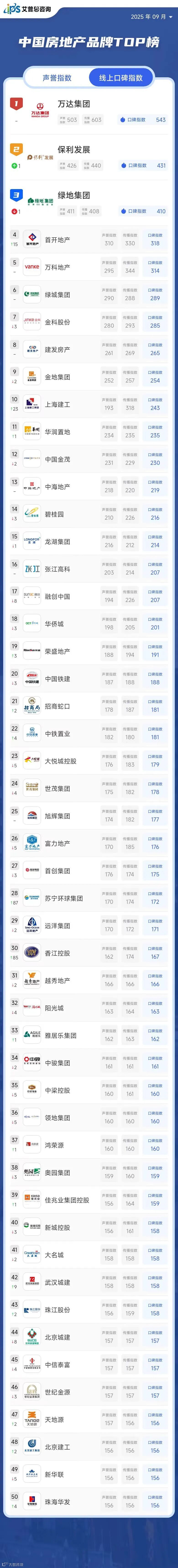 艾普思指数|2025年08月房地产品牌线上口碑指数TOP50