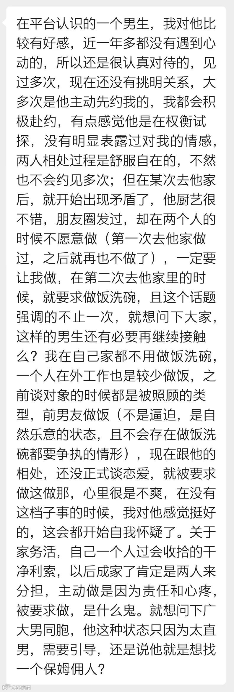 但还没有确认恋爱关系,就被要求做这做那,让她感觉男生是想找个愿意做家务的“保姆”。