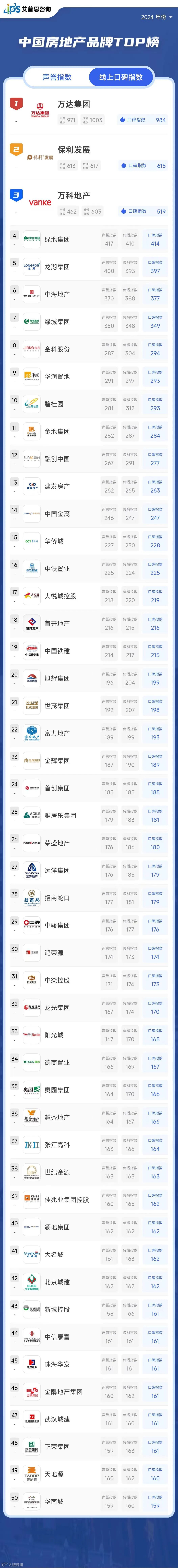 艾普思指数 | 2024年10月中国房地产品牌线上口碑指数TOP50