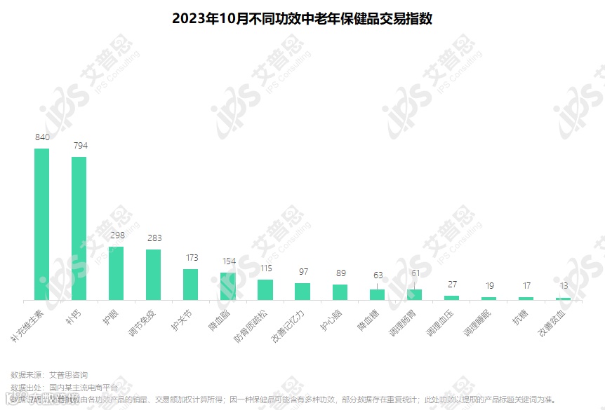 从保健品功效来看,补充维生素、补钙是中老年人最广泛的保健需求,相关产品交易指数分别为840、794。护眼、调节免疫、护关节、降血脂、防骨质疏松类保健品需求也较大,交易指数均大于100。
