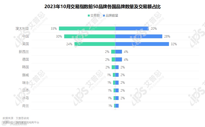 图6.2023年10月交易指数前50品牌各国品牌数量及交易额占比