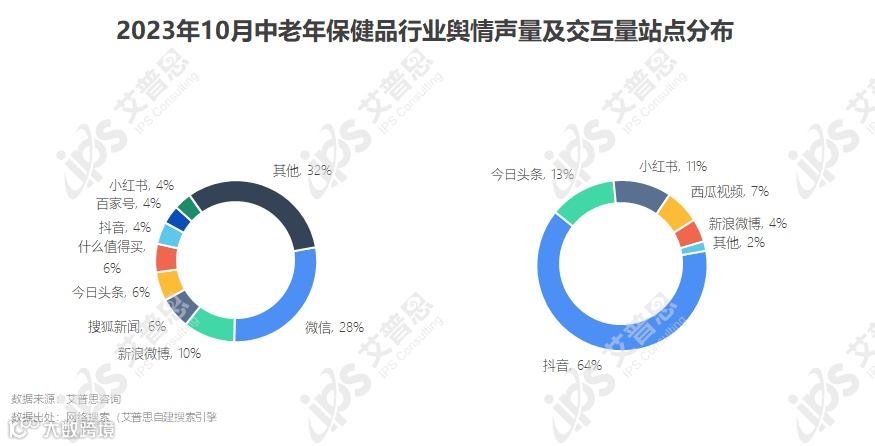 2023年11月,全网中老年保健品行业相关声量共计7.42万条,获得交互量56.37万。相关信息主要分布在微信(28%)、新浪微博(10%)、搜狐新闻(6%)、今日头条(6%)等站点,交互量主要由抖音(64%)、今日头条(13%)、小红书(11%)、西瓜视频(7%)等站点贡献。