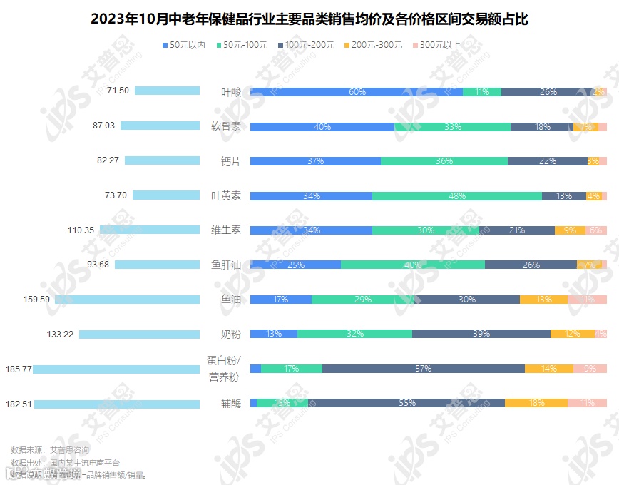 图4.2023年10月中老年保健品行业主要品类销售均价及各价格区间交易额占比