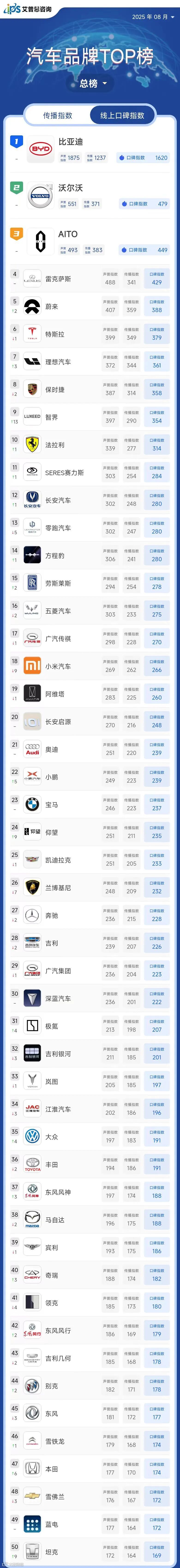 艾普思指数|2025年04月中国汽车品牌线上口碑指数TOP50