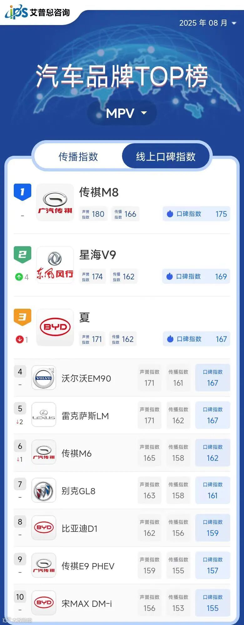 MPV线上口碑指数TOP10
