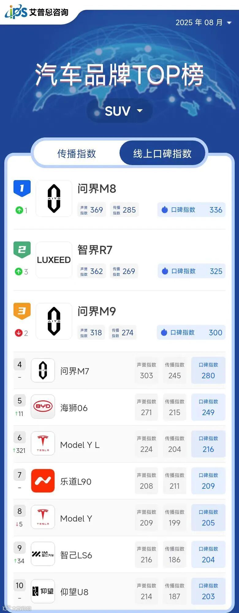 艾普思指数|2025年06月中国汽车品牌线上口碑指数TOP50