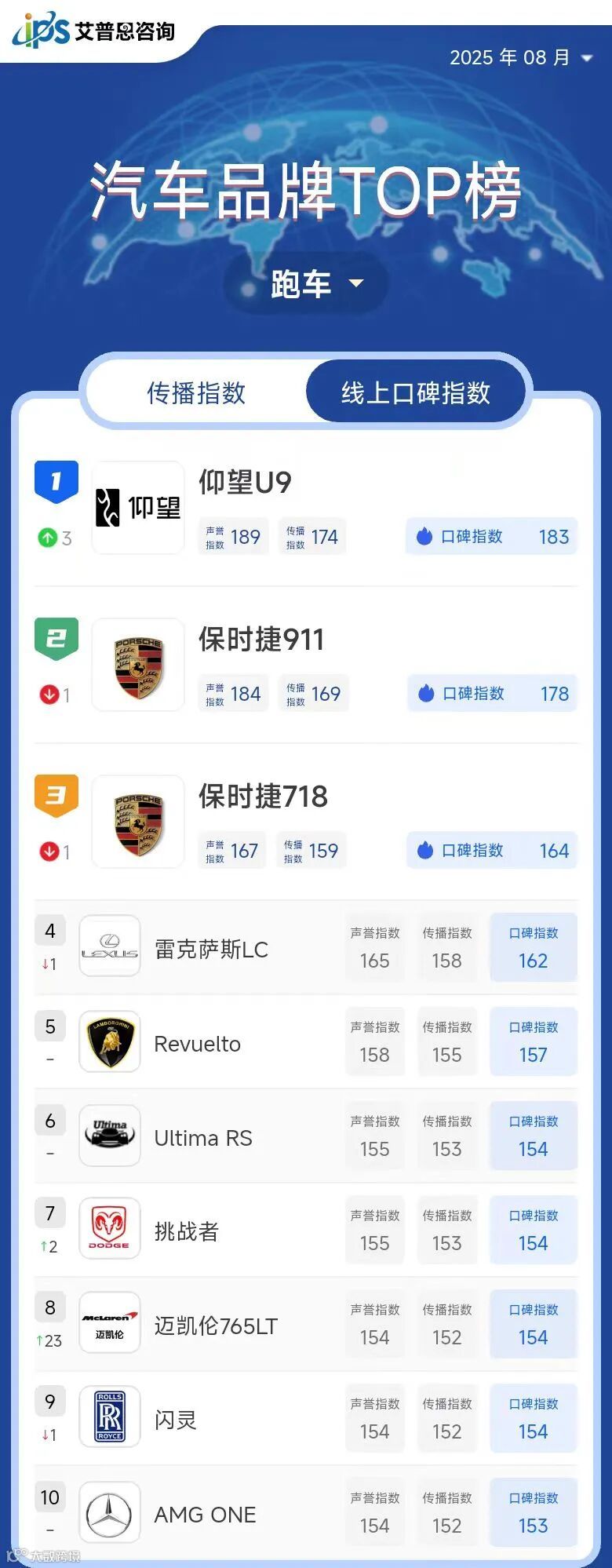 跑车线上口碑指数TOP10