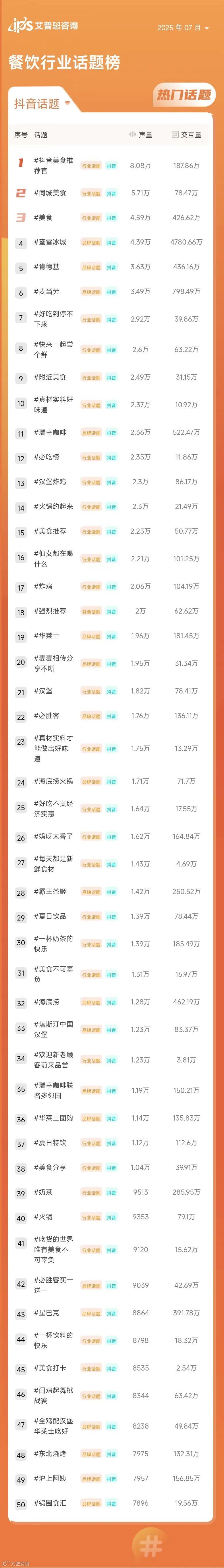 2025年7月餐饮行业排名前三的热门话题为:#抖音美食推荐官(行业话题,声量8.10万,交互量187.86万)、#同城美食(行业话题,声量5.72万,交互量78.47万)、#美食(行业话题,声量4.67万,交互量426.93万)。