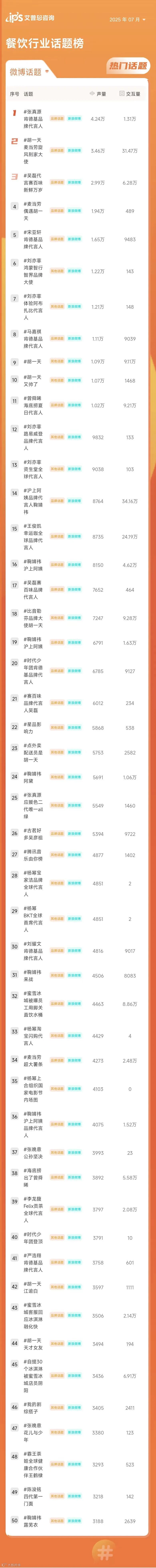 餐饮行业排名前50的热门话题中,包括品牌话题20个、行业话题25个、其他话题5个。