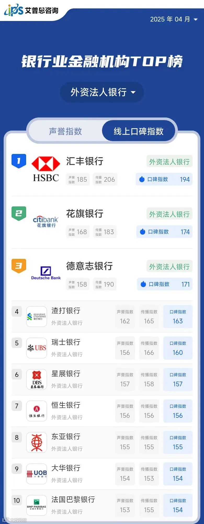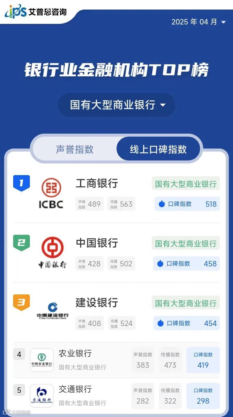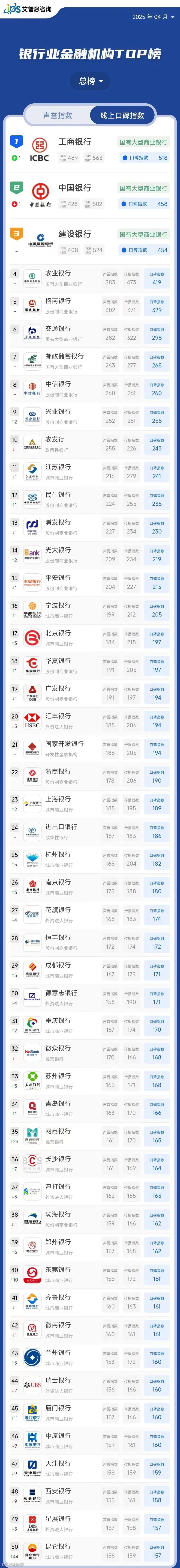 艾普思指数 | 2025年02月银行业金融机构线上口碑指数TOP50