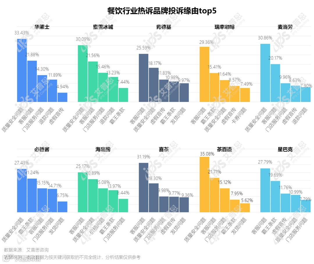 从各品牌的投诉缘由来看,华莱士、蜜雪冰城、麦当劳、茶百道的质量安全问题相对突出,因质量安全问题导致的投诉占比超30%;瑞幸咖啡和喜茶客服问题比较严重。