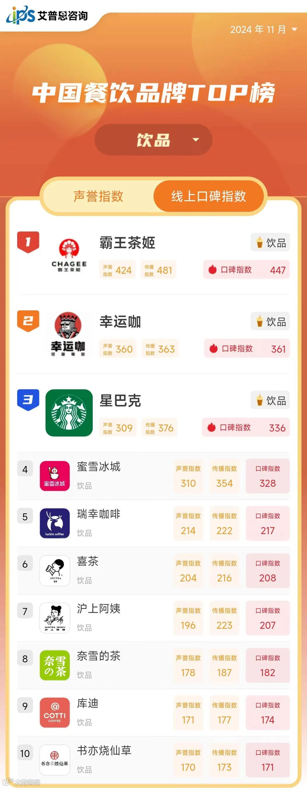 从子指数的表现来看11月传播指数、声誉指数最高的餐饮品牌均为霸王茶姬(传播指数481,声誉指数424)。