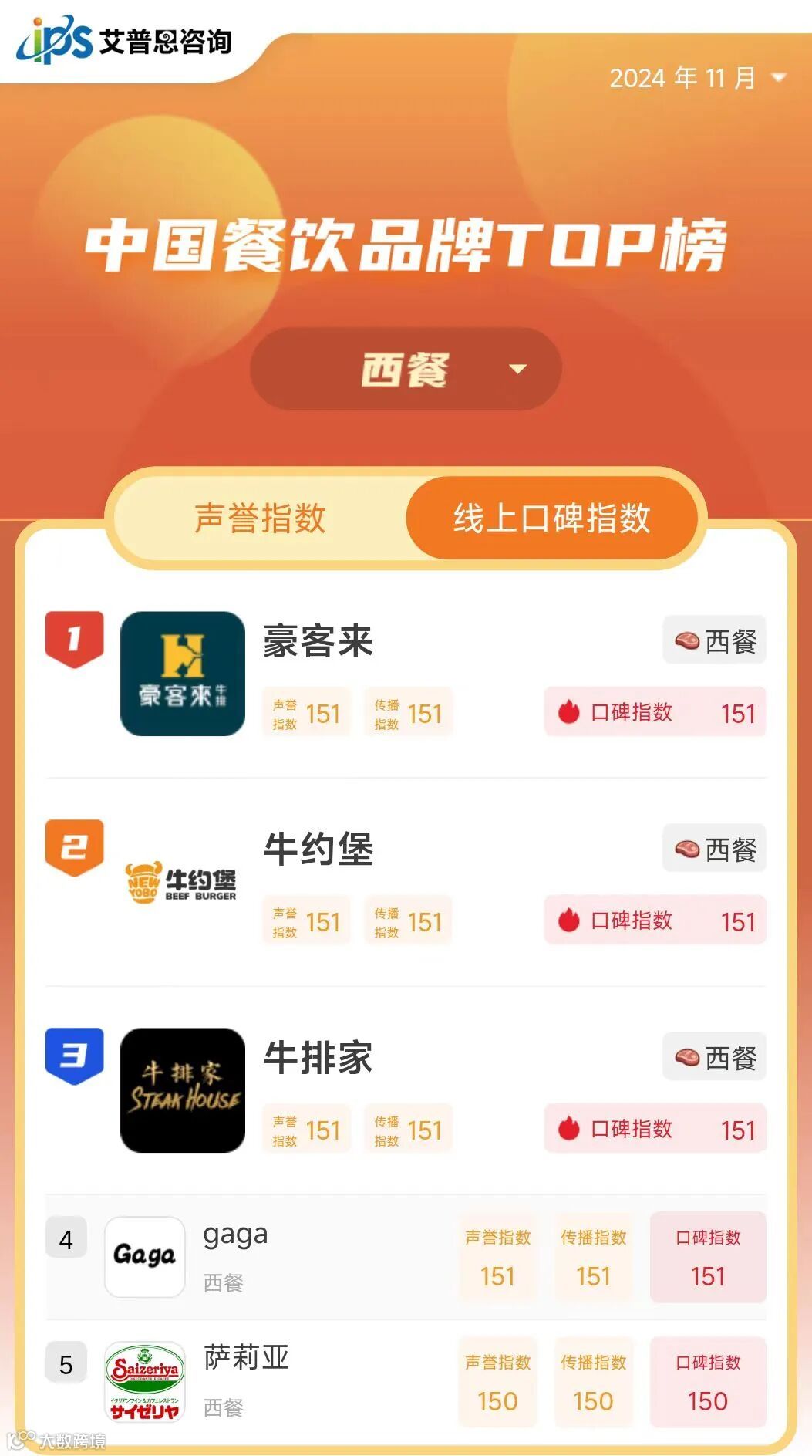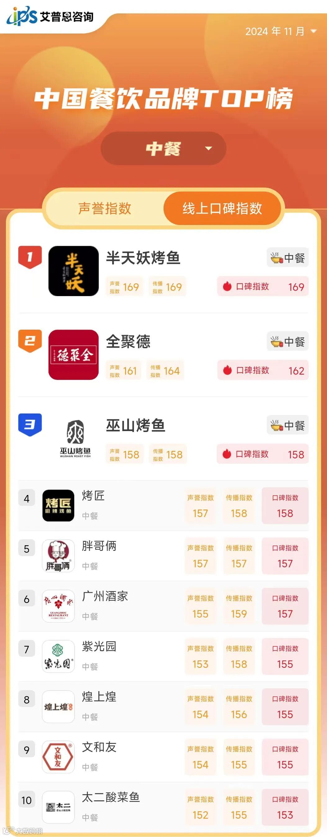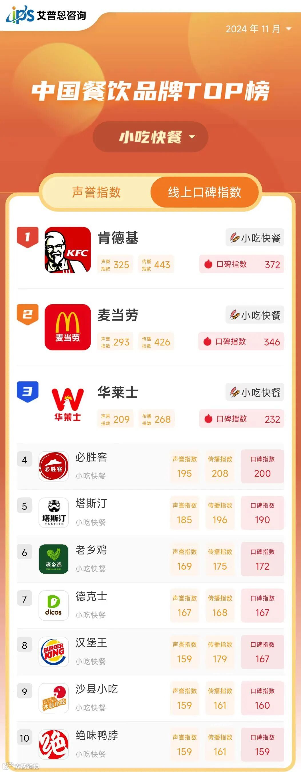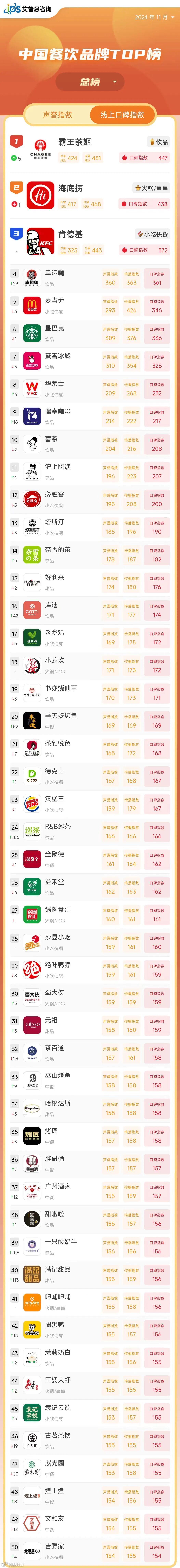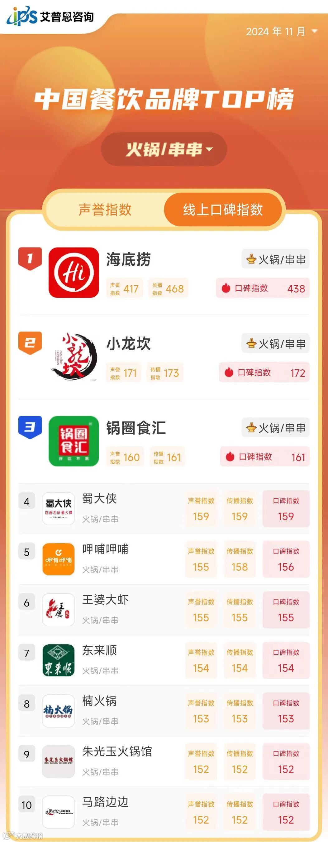 11月线上口碑指数排名前三的餐饮品牌为:霸王茶姬(饮品,口碑指数447,排名较上月上升5位)、海底捞(火锅/串串,口碑指数438,排名较上月下降1位)、肯德基(小吃/快餐,口碑指数372,排名与上月持平)。