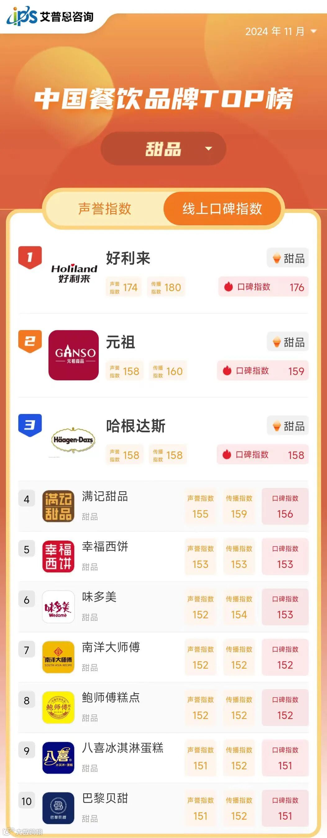 线上口碑指数排名前三的甜品品牌为:好利来、元祖、哈根达斯;线上口碑指数排名前三的饮品品牌为:霸王茶姬、幸运咖*、星巴克;线上口碑指数排名前三的日韩料理品牌为赤坂亭*、汉拿山、韩宫宴;线上口碑指数排名前三的西餐品牌为豪客来、牛约堡、牛排家。