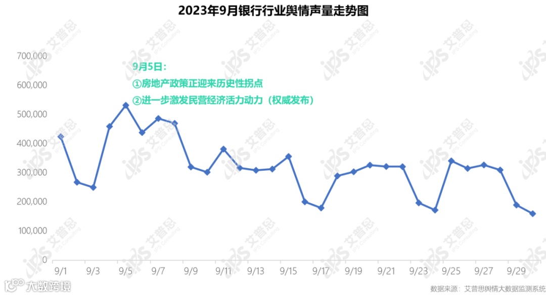 艾普思舆情大数据监测系统显示,9月,涉及银行业的舆情声量为9,572,372篇次,环比下降约11.7%(8月舆情声量为10,836,948篇次),日均声量达319,079篇次。声量高峰主要出现在9月5日(平均声量531,703篇次),主要受“房地产政策正迎来历史性拐点”、“进一步激发民营经济活力动力(权威发布)”、“统筹协调综合施策 力促民营经济发展”等相关信息影响。
