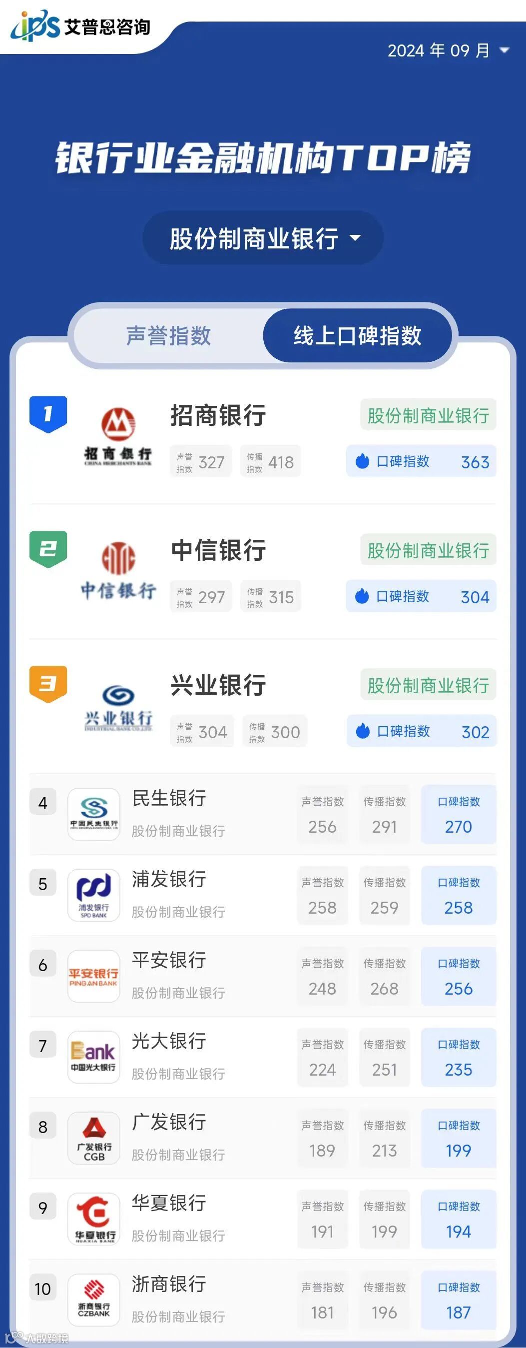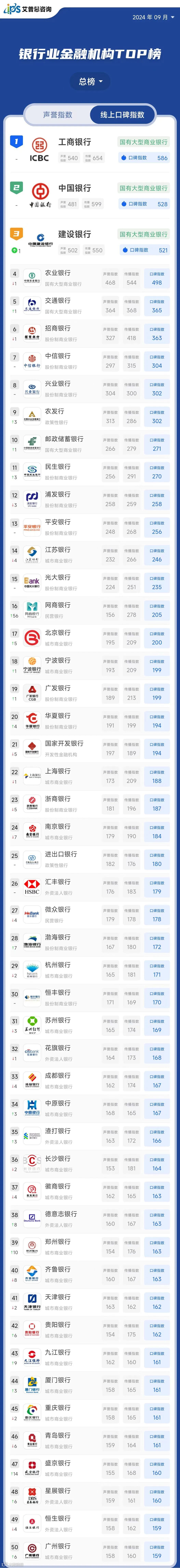 2024年9月线上口碑指数排名前三的银行业金融机构为:工商银行(国有大型商业银行,口碑指数586,排名与上月持平)、中国银行(国有大型商业银行,口碑指数528,排名与上月持平)、建设银行(国有大型商业银行,口碑指数521,排名较上月上升1位)。