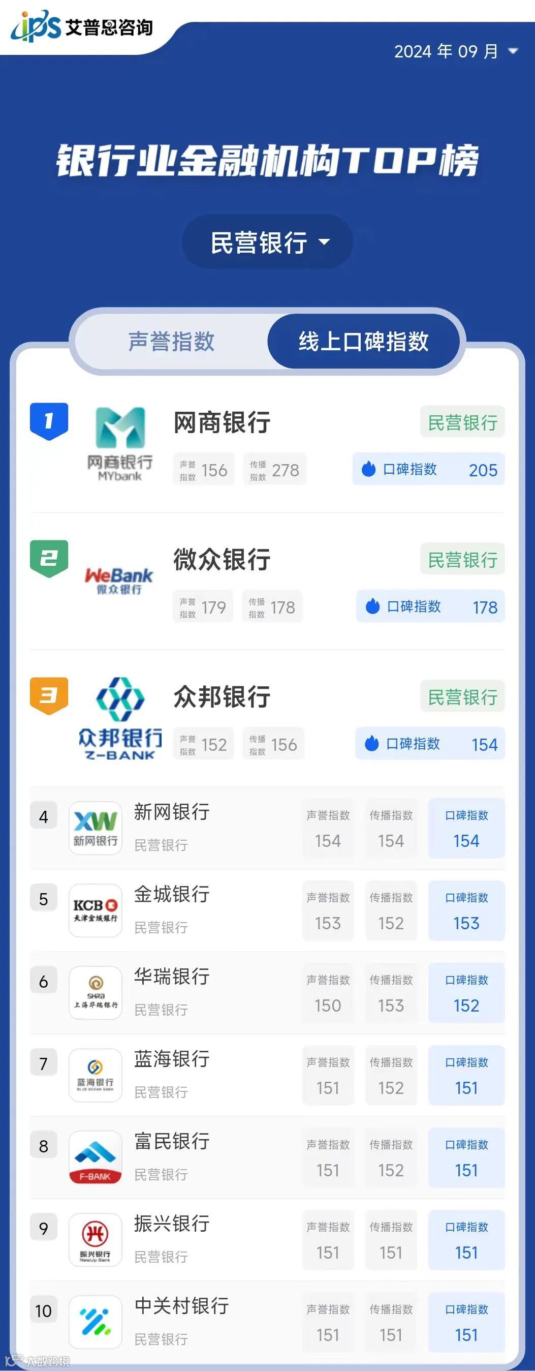 2024年08月中国银行业金融机构线上口碑指数TOP50