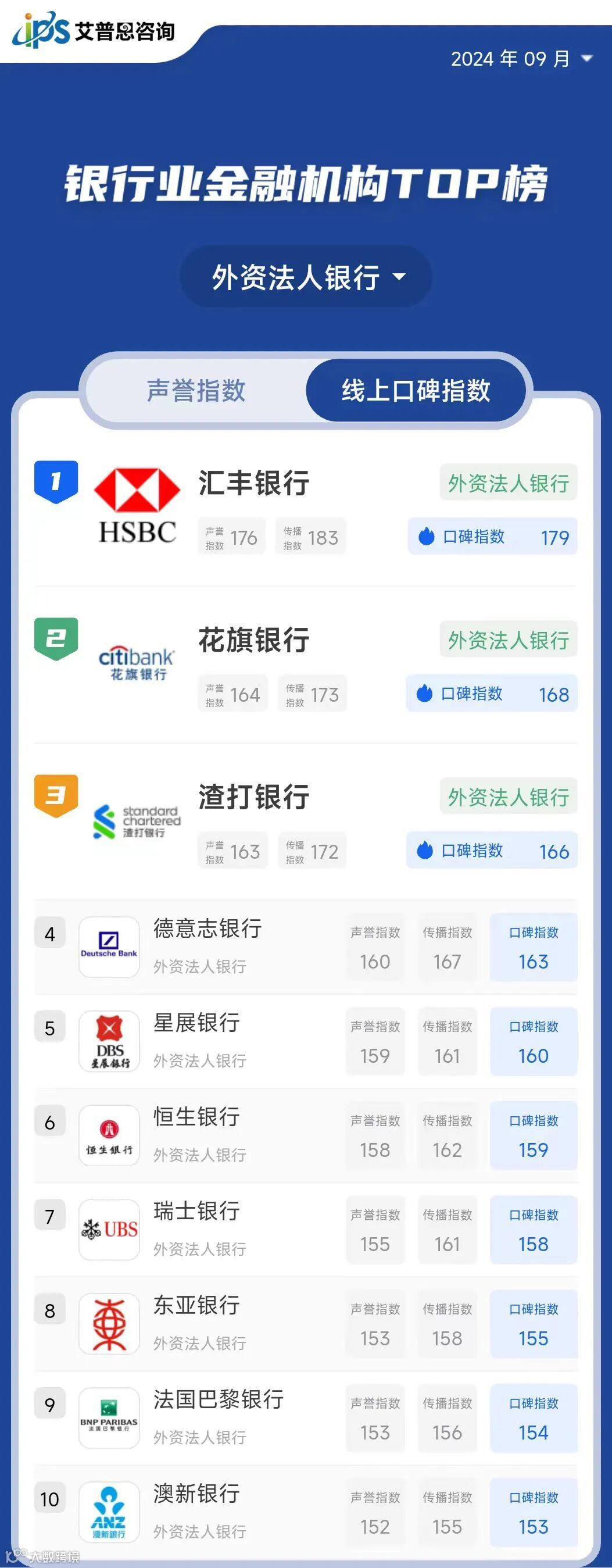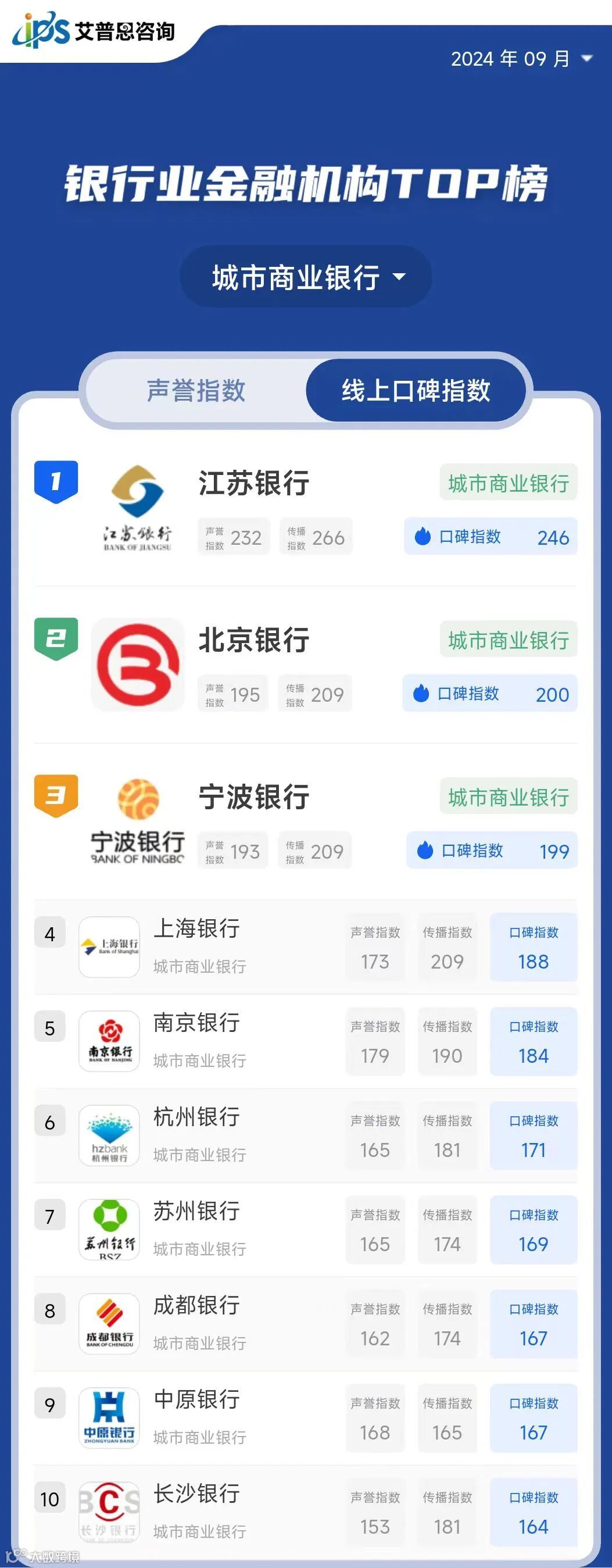 线上口碑指数排名前三的国有大型商业银行为:工商银行、中国银行、建设银行*;线上口碑指数排名前三的股份制商业银行为:招商银行、中信银行、兴业银行;线上口碑指数排名前三的城市商业银行为:江苏银行、北京银行*、宁波银行*;线上口碑指数排名前三的民营银行为:网商银行、微众银行、众邦银行*;线上口碑指数排名前三的外资法人银行为:汇丰银行、花旗银行、渣打银行*。