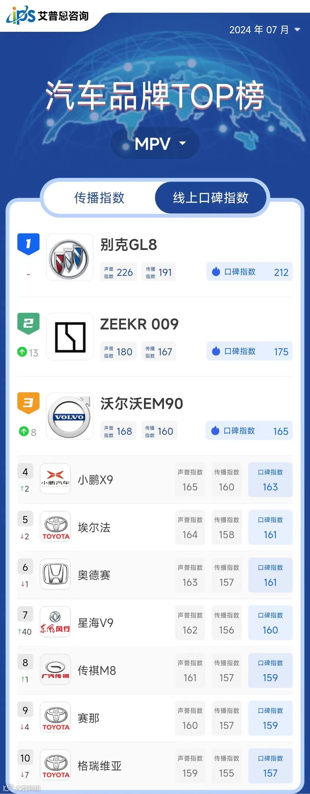 MPV线上口碑指数TOP10