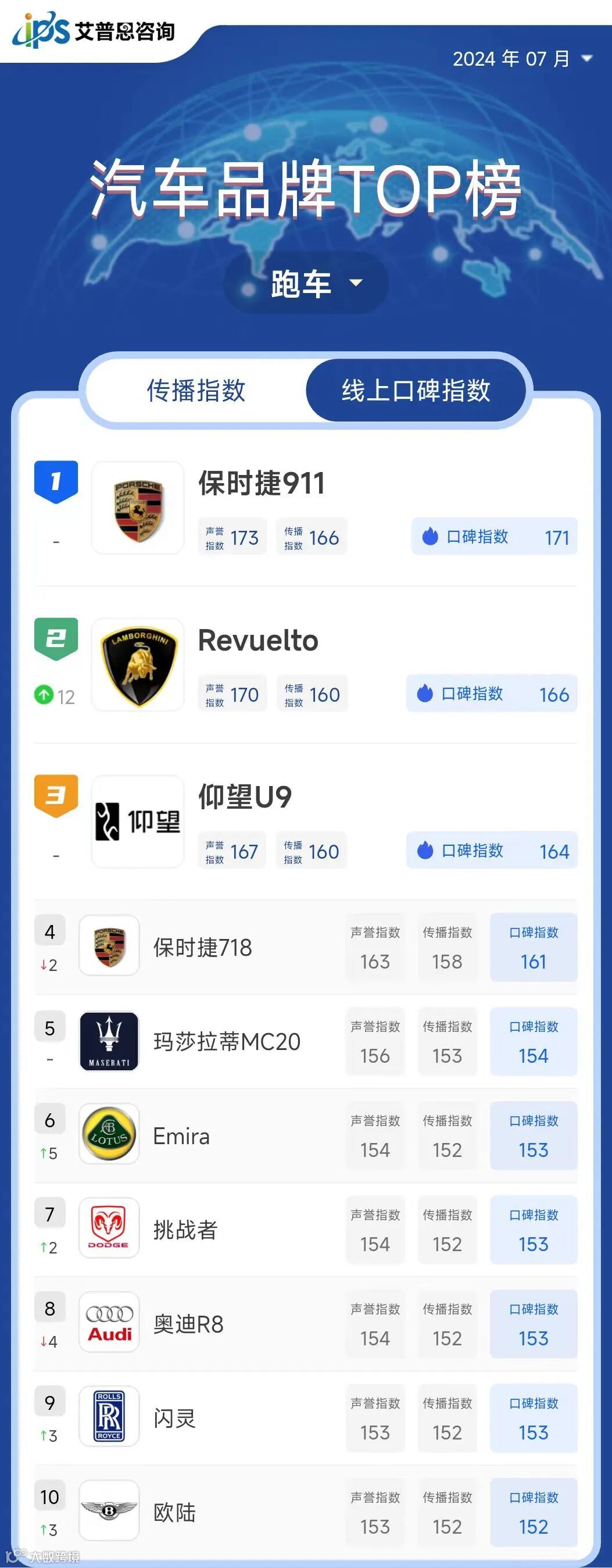 跑车线上口碑指数TOP10