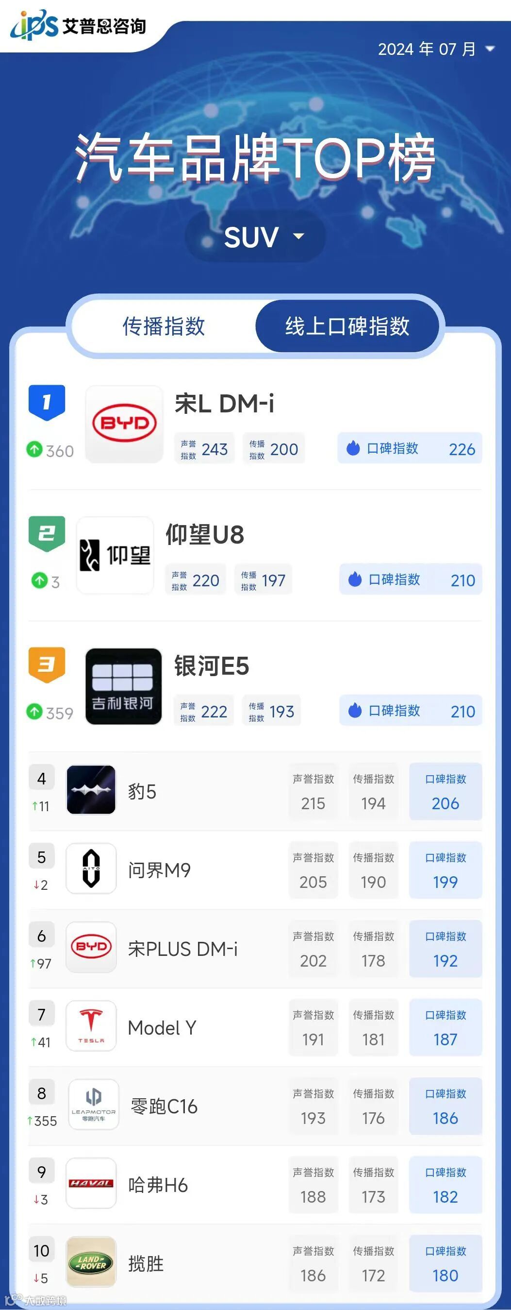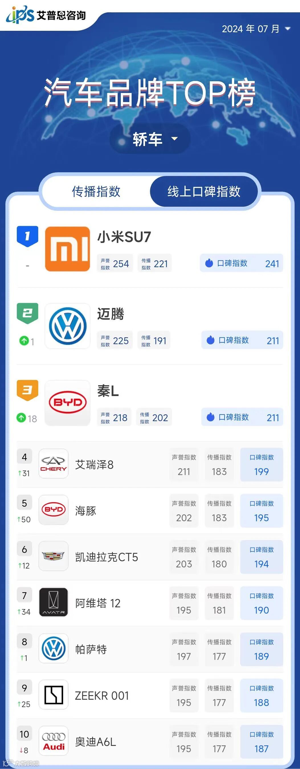 艾普思指数 | 2024年06月中国汽车品牌线上口碑指数TOP50
