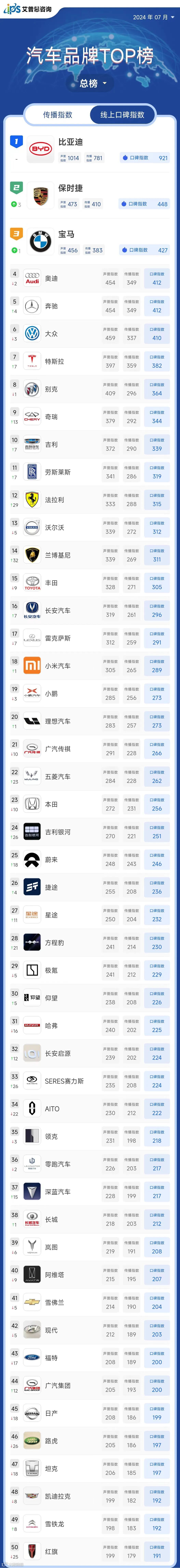 艾普思指数 | 2024年04月中国汽车品牌线上口碑指数TOP50