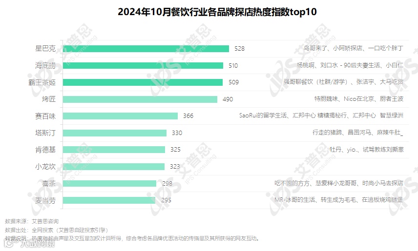 2024年10月,星巴克、海底捞、霸王茶姬等品牌探店指数最高。探店星巴克的博主中,鸟哥来了、小阿娇探店、一口吃个胖丁等博主获得交互量较高;探店海底捞的博主中,杨桃啊、刘口水 - 90后夫妻生活、小白仁等博主获得交互量较高;探店霸王茶姬的博主中,强哥聊餐饮(社群/游学)、张洁宇、大马吃货等博主获得交互量较高。