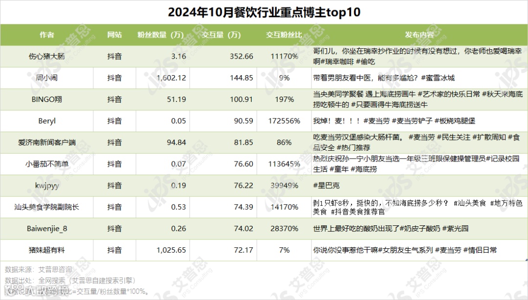 2024年10月,伤心猪大肠、周小闹、BINGO翔等博主获得交互量较高,Beryl、小番茄不简单、kwjpyy等博主交互粉丝比较高。从发布内容来看,博主就餐过程中的趣味视频及参与品牌活动的视频获得的交互量较多。