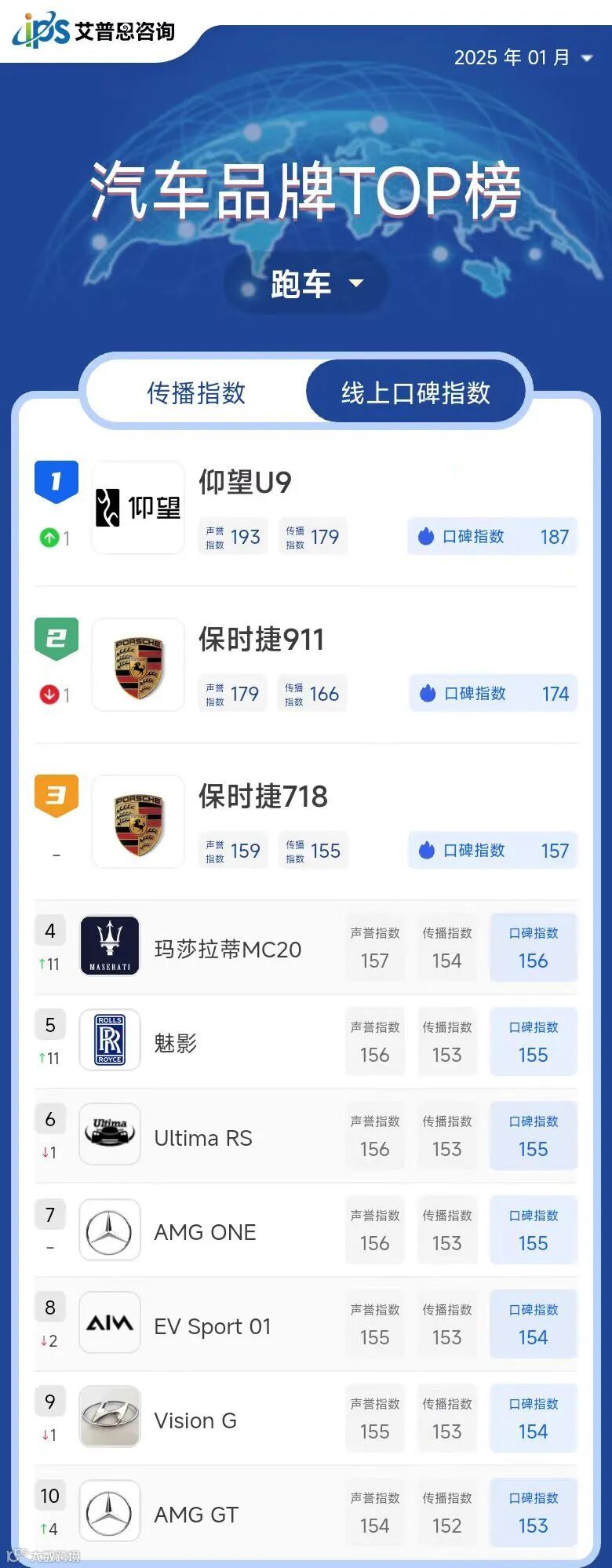 跑车线上口碑指数TOP10