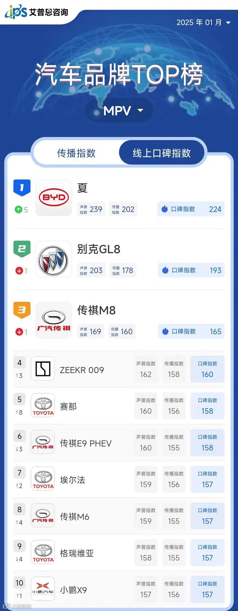 MPV线上口碑指数TOP10