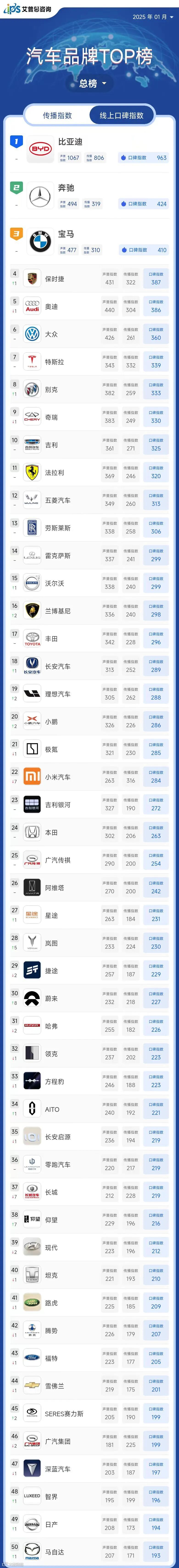 2025年1月线上口碑指数排名前三的汽车品牌为:比亚迪(口碑指数963,排名与上月持平)、奔驰(口碑指数424,排名与上月持平)、宝马(口碑指数410,排名与上月持平);