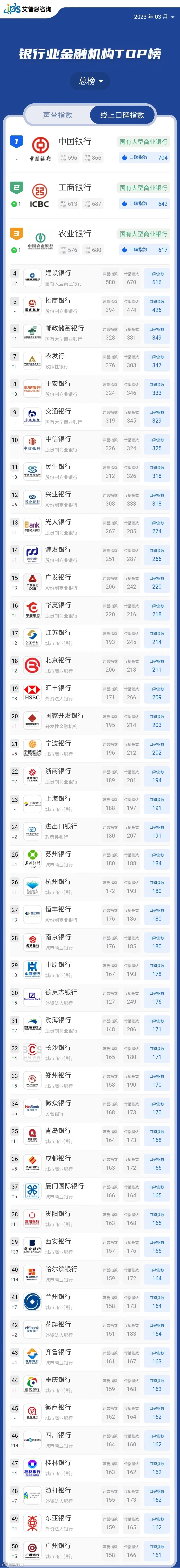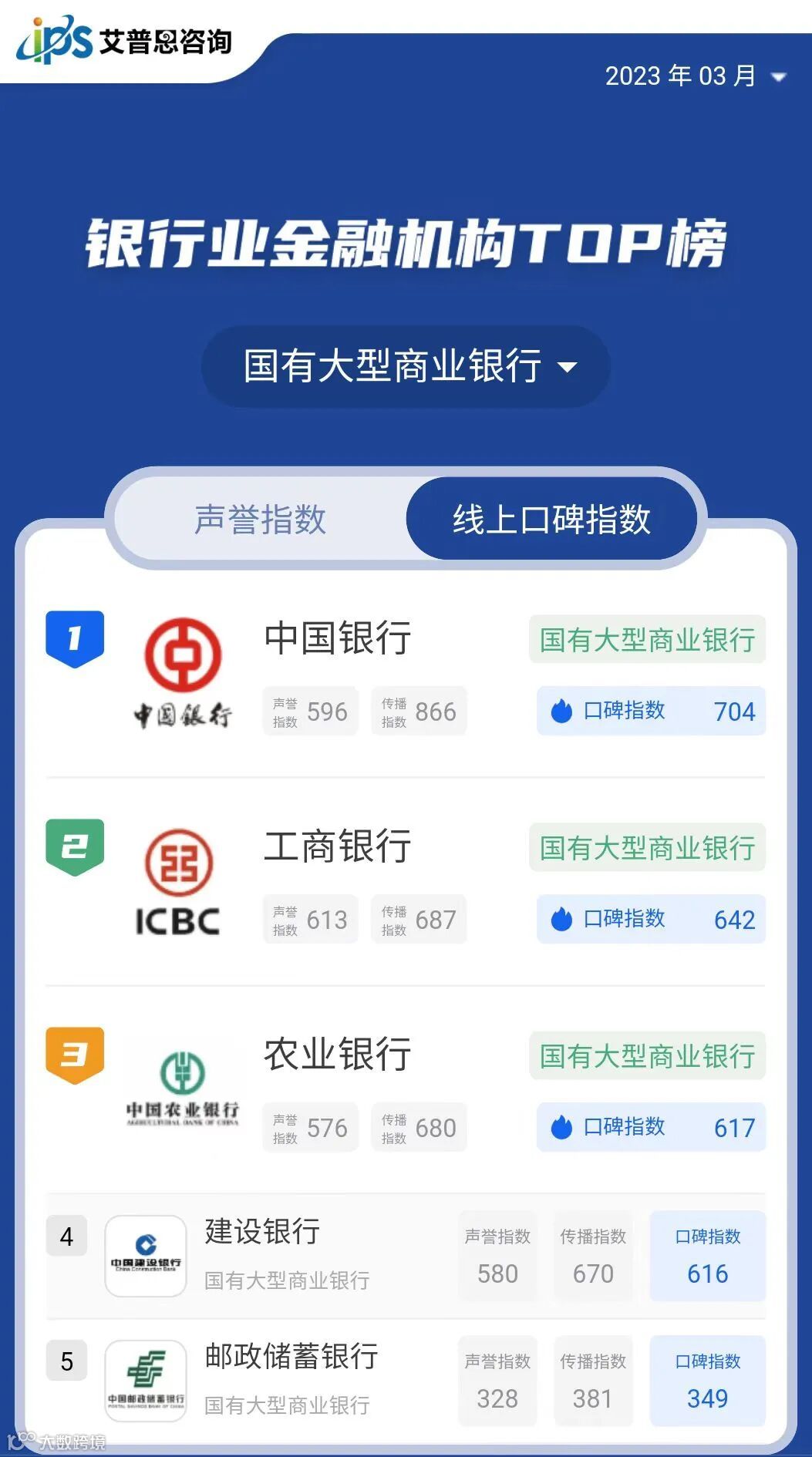 2023年3月线上口碑指数排名前三的银行业金融机构为:中国银行(国有大型商业银行,口碑指数704,排名与上月持平)、工商银行(国有大型商业银行,口碑指数642,排名较上月上升1位)、农业银行(国有大型商业银行,口碑指数617,排名较上月上升1位)。