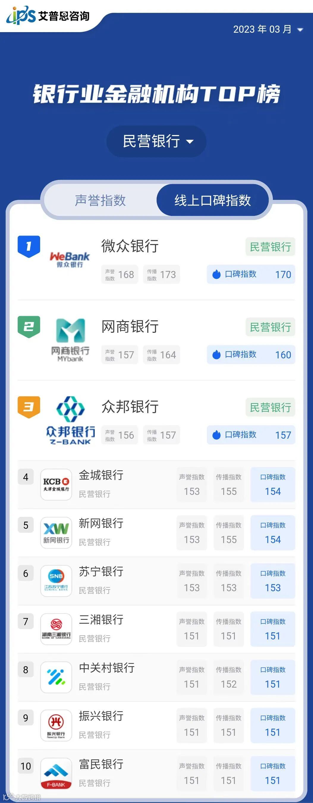 继《中国房地产品牌线上口碑指数排行榜》、《中国餐饮品牌线上口碑指数排行榜》之后,我们发布了原创指数“艾普思品牌线上口碑指数”的又一应用榜单——《中国银行业金融机构线上口碑指数排行榜》。近年来,我国银行机构业务量不断增长,因还款、服务、扣费等问题引发的消费纠纷屡见不鲜,随之产生的客户投诉、维权舆情、消极评论等通过网络大量传播,对机构的声誉和形象构成挑战。榜单旨在依托互联网文本大数据分析技术,助力银行机构在纷繁复杂的舆论环境中精准洞察自身线上口碑表现,从而提高声誉风险管理工作的有效性,增强抗风险能力,促进机构持续健康发展。