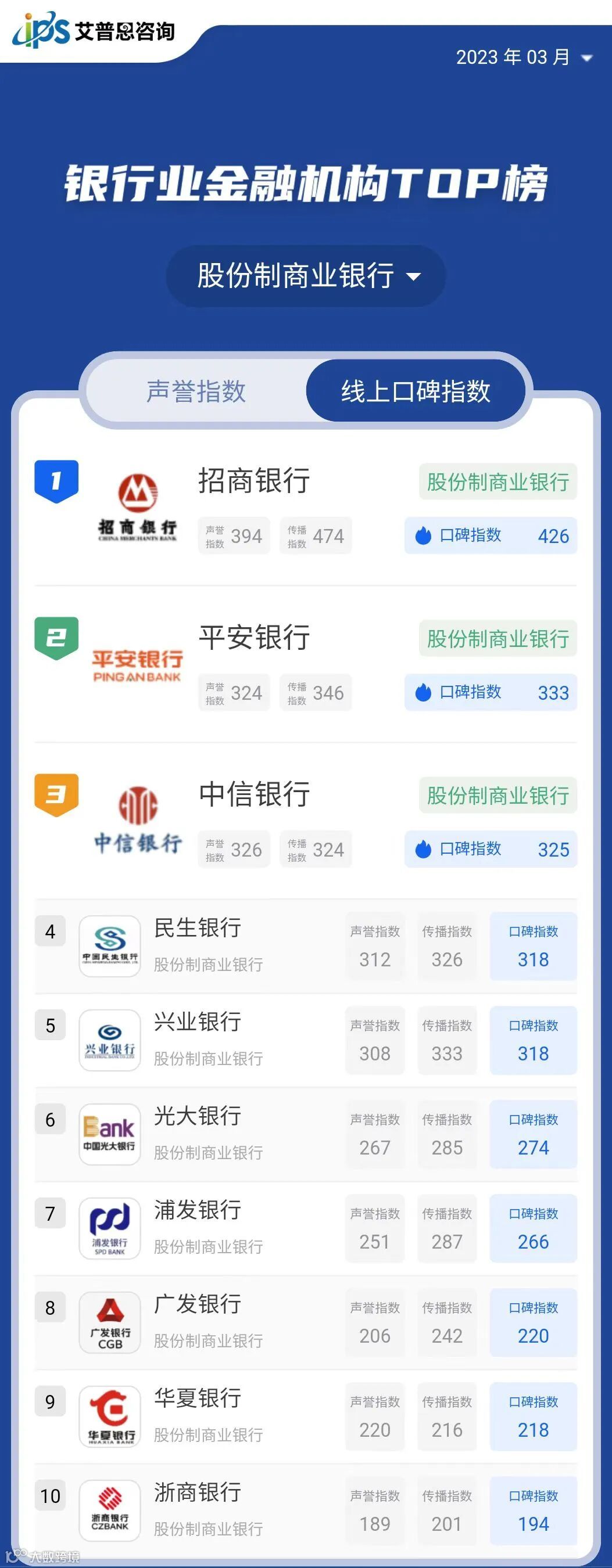线上口碑指数排名前三的国有大型商业银行为:中国银行、工商银行、农业银行*;线上口碑指数排名前三的股份制商业银行为:招商银行、平安银行*、中信银行;线上口碑指数排名前三的城市商业银行为:江苏银行、北京银行、宁波银行;线上口碑指数排名前三的民营银行为:微众银行、网商银行、众邦银行;线上口碑指数排名前三的外资法人银行为:汇丰银行*、德意志银行、花旗银行*。