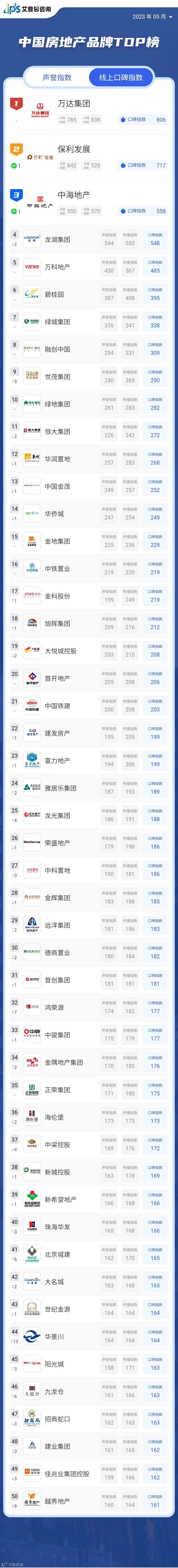 5月线上口碑指数位列前三的房地产品牌为:万达集团(口碑指数806,排名与上月持平)、保利发展(口碑指数717,排名较上月上升1位)、中海地产(口碑指数558,排名较上月上升1位)。万达集团品牌传播优势和声誉表现持续向好,传播指数、声誉指数及综合口碑指数均位列第1。
