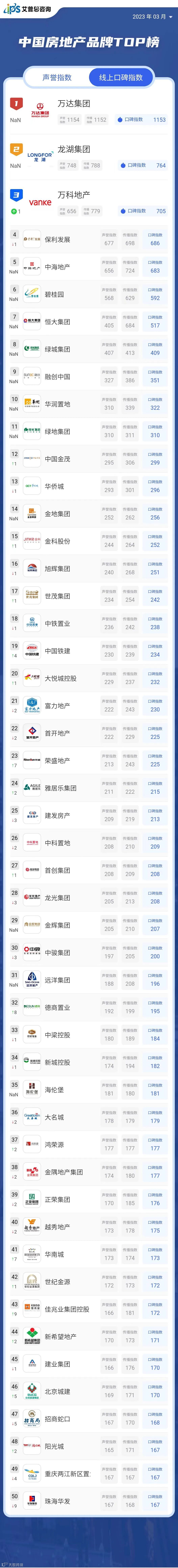 艾普思指数|2023年03月中国房地产品牌线上口碑指数TOP50