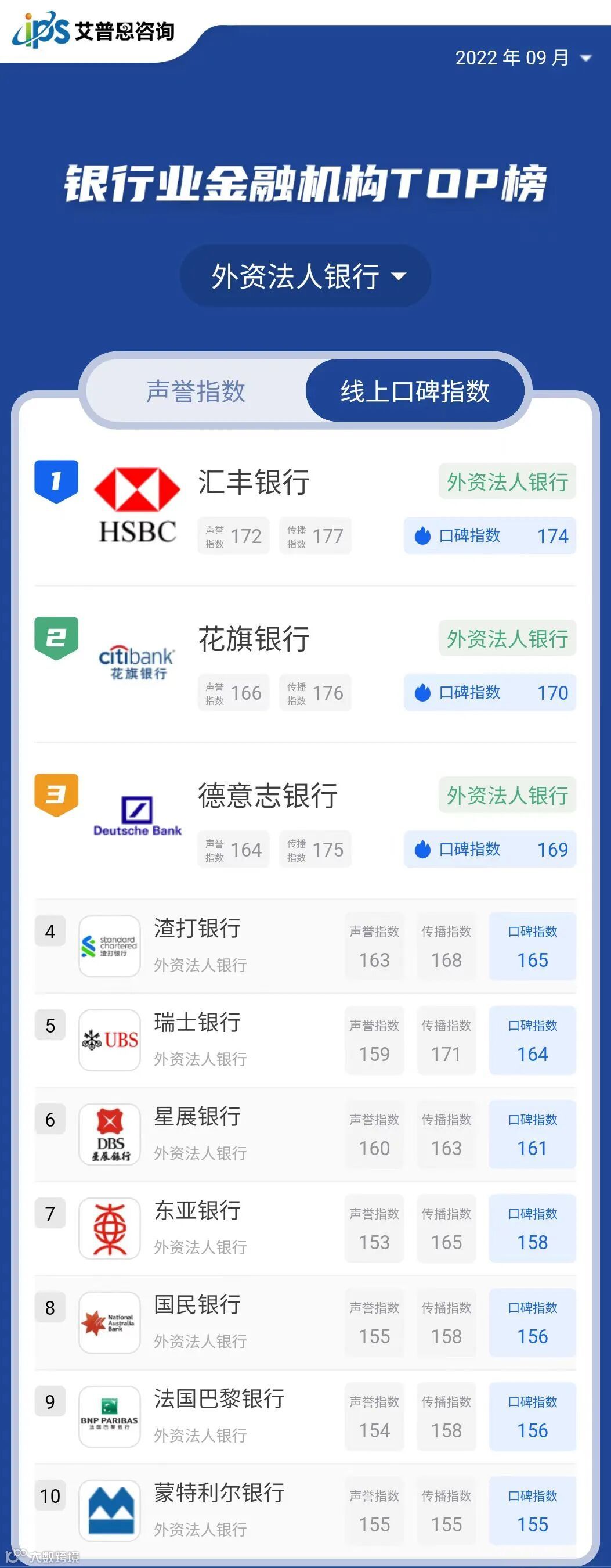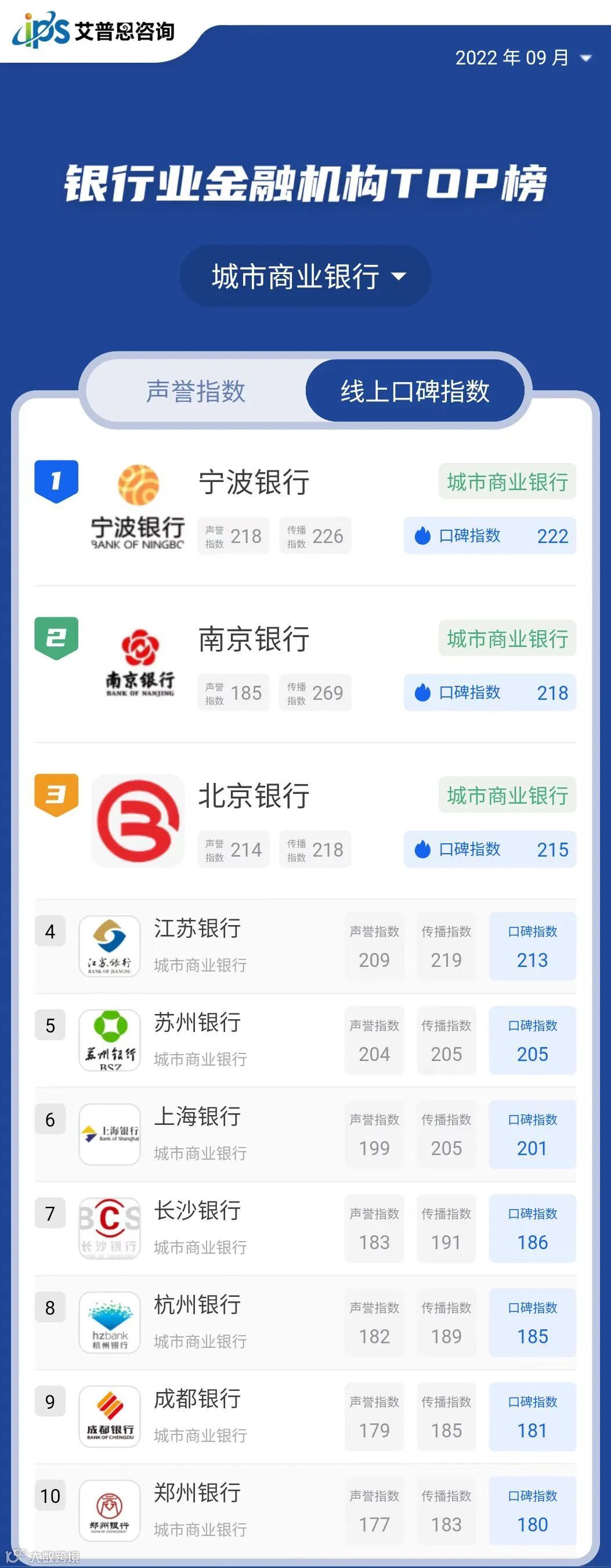 继《中国房地产品牌线上口碑指数排行榜》、《中国餐饮品牌线上口碑指数排行榜》之后,我们发布了原创指数“艾普思品牌线上口碑指数”的又一应用榜单——《中国银行业金融机构线上口碑指数排行榜》。近年来,我国银行机构业务量不断增长,因还款、服务、扣费等问题引发的消费纠纷屡见不鲜,随之产生的客户投诉、维权舆情、消极评论等通过网络大量传播,对机构的声誉和形象构成挑战。榜单旨在依托互联网文本大数据分析技术,助力银行机构在纷繁复杂的舆论环境中精准洞察自身线上口碑表现,从而提高声誉风险管理工作的有效性,增强抗风险能力,促进机构持续健康发展。