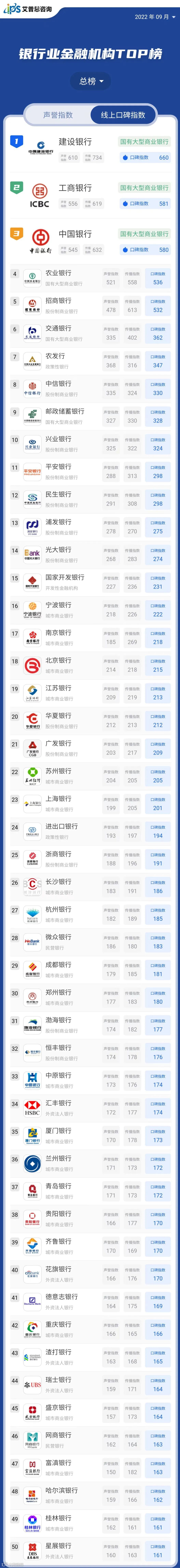 线上口碑指数排名前50的银行业金融机构中,包括城市商业银行21家、股份制银行12家、外资法人银行6家、国有大型商业银行6家、政策性银行2家、民营银行2家、开发性金融机构1家。