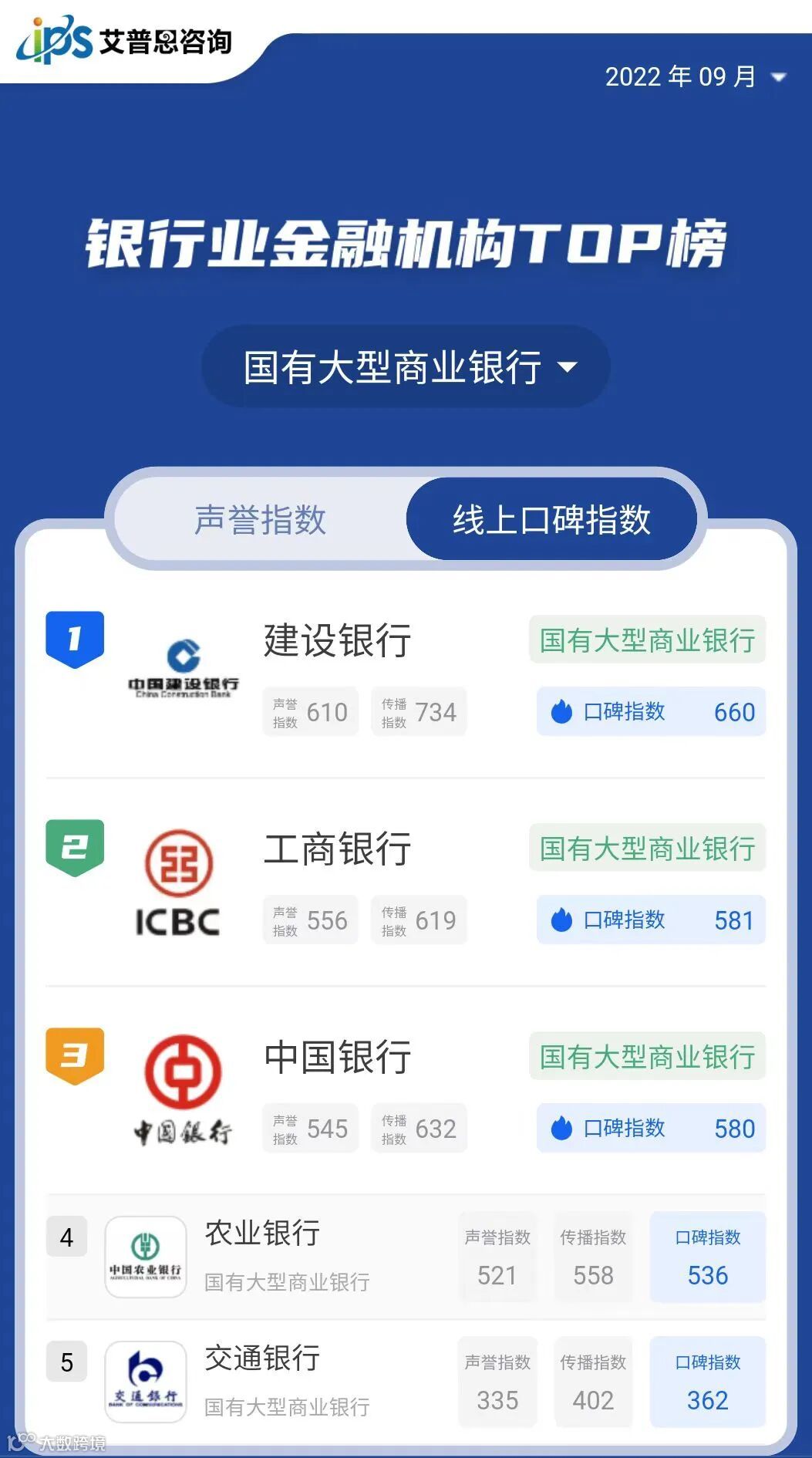 2022年9月线上口碑指数排名前三的银行业金融机构为:建设银行(国有大型商业银行,口碑指数660)、工商银行(国有大型商业银行,口碑指数581)、中国银行(国有大型商业银行,口碑指数580)。