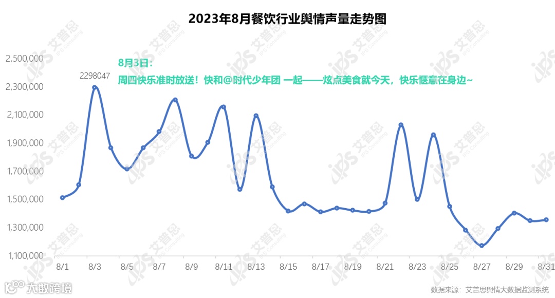 艾普思舆情大数据监测系统显示,8月,涉及餐饮行业的舆情声量为51,058,978篇次,较上月有所上升(7月舆情声量为48,138,058篇次),日均声量达1,647,063篇次。从声量走势来看,声量高峰期在8月3日,主要由 “周四快乐准时放送!快和@时代少年团 一起——炫点美食就今天,快乐惬意在身边~”带动声量。