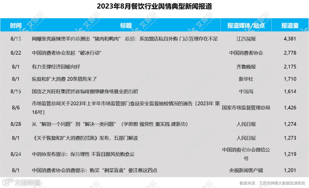 8月,餐饮行业舆情典型报道有《网曝张亮麻辣烫羊肉检测出“猪肉和鸭肉” 总部:系加盟店私自外购 门店管理存在不足》、《中国消费者协会发起“破冰行动”》、《有力支撑经济回暖向好》等,报道量排名前十的信息为: